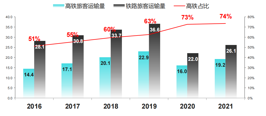 隨著覆蓋面越來越廣,中國高鐵在推動區域經濟發展、促進城際人文交流方面的價值和作用也愈發凸顯。根據《報告》,我國鐵路運輸安全質量各項指標居世界前列,客運周轉量、貨運周轉量等主要鐵路運輸經濟指標穩居世界第一。高鐵旅客運輸量占鐵路旅客運輸量也從2016年的51%擴大到2021年的74%,占比持續攀升,高鐵出行快速、便捷和舒適,已成為國民出行的首選交通方式之一。