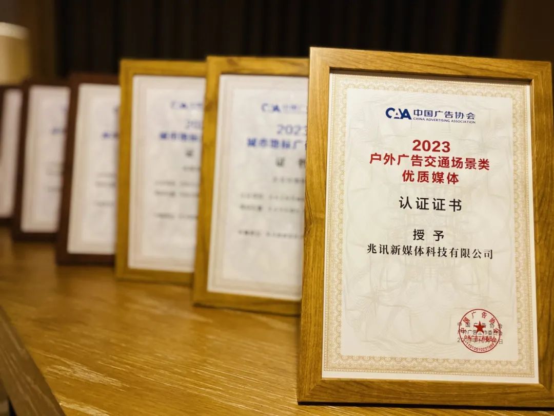 會議期間,2023年度“戶外廣告優質媒體”、“城市地標廣告媒體”、“益世紀錄(2023)中國戶外廣告之最”評選榜單重磅揭曉。兆訊傳媒憑借行業領先的媒體資源優勢,榮攬“城市地標廣告媒體”(廣州、太原、貴陽、成都、重慶、北京六地)、“中國戶外廣告之最:全國高鐵站核心候車區數字媒體數量最多”、“戶外廣告交通場景類優質媒體”三類獎項認證。
